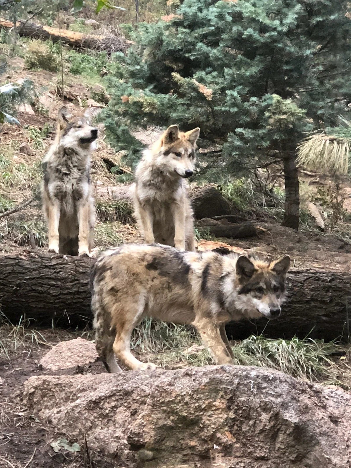 The Mexican wolf pack I worked with at Cheyenne Mountain Zoo was a family that consisted of mom, dad, and 2 generations of offspring. They all had different relationships with one another, including some drama between sisters as they reached sexual maturity, but also beautiful relationships that displayed cooperation like older sisters babysitting the newborn in the den, or mom wolf, Luna, bringing food to her mate, Navarro, when he was too shy to come down to eat. They played together after feeding, looking very similar to social dogs in a dog park. Like dogs, they sometimes displayed subtle communication to one another that meant “I’m uncomfortable, please give me space” or “That’s mine, get away,” but that was communication due to conditions, not due to a hierarchy. The pack certainly had a leader in mom Luna, but in a way that displayed experience in the routine at the zoo, and she was nurturing and protective over her family. She even peed on the food so that “neighboring competitors” didn’t dare to steal any.